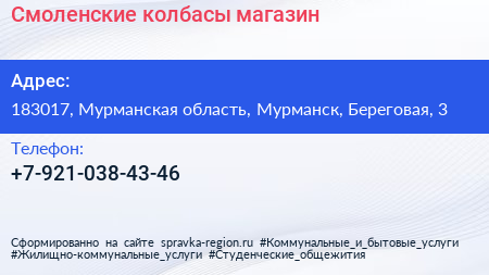 Смоленские колбасы, магазин по адресу 183017, Мурманская область, Мурманск, Береговая, 3 в дальнейшем Организация, размещена в следующих категориях: