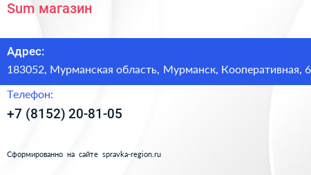 Sum, магазин по адресу 183052, Мурманская область, Мурманск, Кооперативная, 6 в дальнейшем Организация, размещена в следующих категориях: