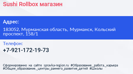 Sushi Rollbox, магазин по адресу 183052, Мурманская область, Мурманск, Кольский проспект, 158/1 в дальнейшем Организация, размещена в следующих категориях: