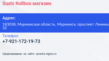 Sushi Rollbox, магазин по адресу 183038, Мурманская область, Мурманск, проспект Ленина, 32 в дальнейшем Организация, размещена в следующих категориях: