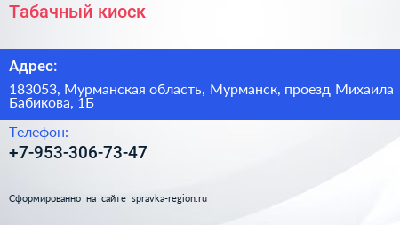 Табачный киоск по адресу 183053, Мурманская область, Мурманск, проезд Михаила Бабикова, 1Б в дальнейшем Организация, размещена в следующих категориях: