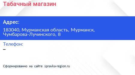 Табачный магазин по адресу 183040, Мурманская область, Мурманск, Чумбарова-Лучинского, 8 в дальнейшем Организация, размещена в следующих категориях: