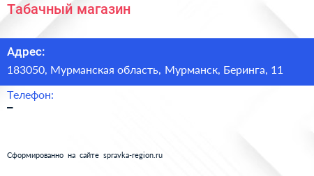 Табачный магазин по адресу 183050, Мурманская область, Мурманск, Беринга, 11 в дальнейшем Организация, размещена в следующих категориях: