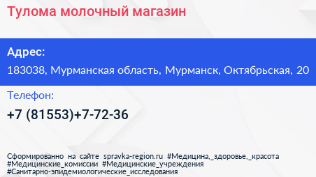 Тулома, молочный магазин по адресу 183038, Мурманская область, Мурманск, Октябрьская, 20 в дальнейшем Организация, размещена в следующих категориях: