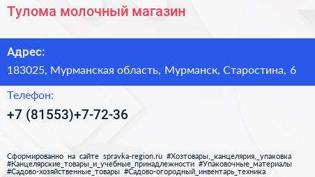 Тулома, молочный магазин по адресу 183025, Мурманская область, Мурманск, Старостина, 6 в дальнейшем Организация, размещена в следующих категориях: