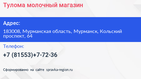 Тулома, молочный магазин по адресу 183008, Мурманская область, Мурманск, Кольский проспект, 64 в дальнейшем Организация, размещена в следующих категориях: