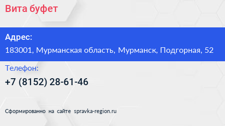 Вита, буфет по адресу 183001, Мурманская область, Мурманск, Подгорная, 52 в дальнейшем Организация, размещена в следующих категориях: