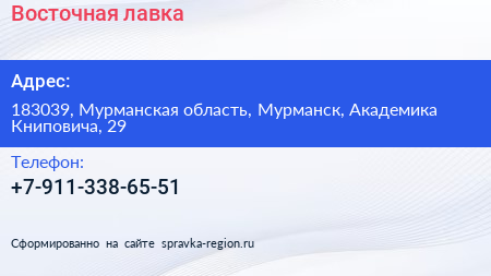 Восточная лавка по адресу 183039, Мурманская область, Мурманск, Академика Книповича, 29 в дальнейшем Организация, размещена в следующих категориях:
