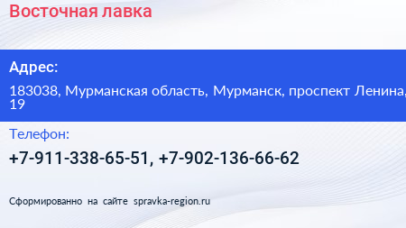 Восточная лавка по адресу 183038, Мурманская область, Мурманск, проспект Ленина, 19 в дальнейшем Организация, размещена в следующих категориях: