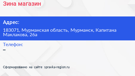 Зина, магазин по адресу 183071, Мурманская область, Мурманск, Капитана Маклакова, 26а в дальнейшем Организация, размещена в следующих категориях: