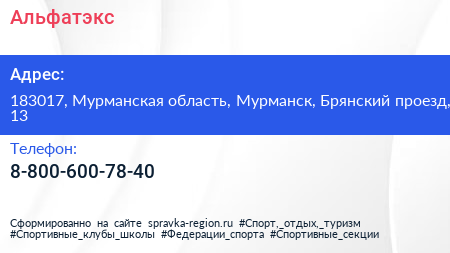 Альфатэкс по адресу 183017, Мурманская область, Мурманск, Брянский проезд, 13 в дальнейшем Организация, размещена в следующих категориях: