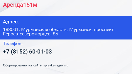 Аренда151м по адресу 183031, Мурманская область, Мурманск, проспект Героев-североморцев, 86 в дальнейшем Организация, размещена в следующих категориях: