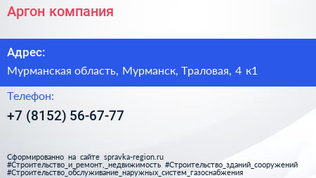 Аргон, компания по адресу Мурманская область, Мурманск, Траловая, 4 к1 в дальнейшем Организация, размещена в следующих категориях: