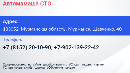 Автомамаша, СТО по адресу 183052, Мурманская область, Мурманск, Шевченко, 40 в дальнейшем Организация, размещена в следующих категориях: