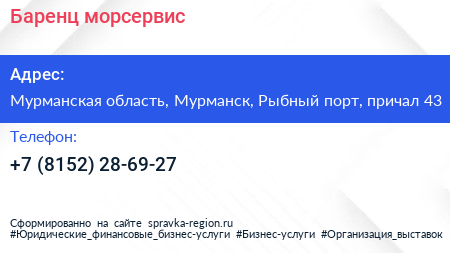 Баренц морсервис по адресу Мурманская область, Мурманск, Рыбный порт, причал 43 в дальнейшем Организация, размещена в следующих категориях: