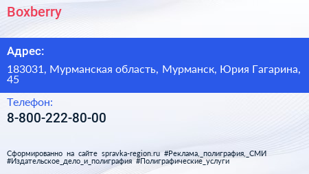 Boxberry по адресу 183031, Мурманская область, Мурманск, Юрия Гагарина, 45 в дальнейшем Организация, размещена в следующих категориях: