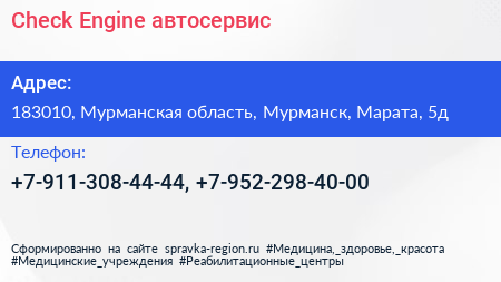 Check Engine, автосервис по адресу 183010, Мурманская область, Мурманск, Марата, 5д в дальнейшем Организация, размещена в следующих категориях: