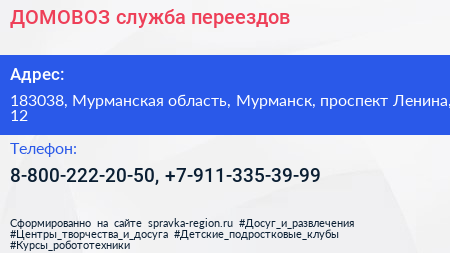 ДОМОВОЗ, служба переездов по адресу 183038, Мурманская область, Мурманск, проспект Ленина, 12 в дальнейшем Организация, размещена в следующих категориях: