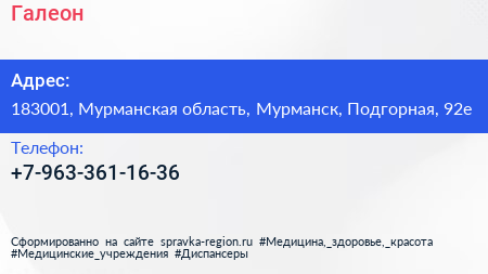 Галеон по адресу 183001, Мурманская область, Мурманск, Подгорная, 92е в дальнейшем Организация, размещена в следующих категориях: