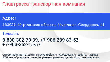 Главтрасса, транспортная компания по адресу 183031, Мурманская область, Мурманск, Свердлова, 11 в дальнейшем Организация, размещена в следующих категориях: