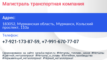 Магистраль, транспортная компания по адресу 183052, Мурманская область, Мурманск, Кольский проспект, 110а в дальнейшем Организация, размещена в следующих категориях:
