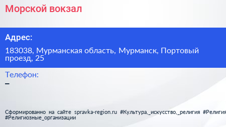 Морской вокзал по адресу 183038, Мурманская область, Мурманск, Портовый проезд, 25 в дальнейшем Организация, размещена в следующих категориях: