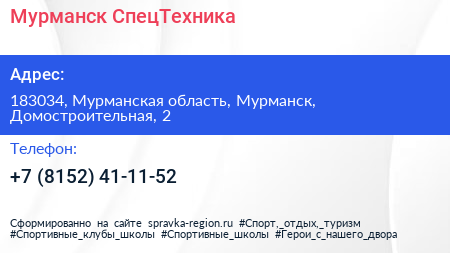 Мурманск СпецТехника по адресу 183034, Мурманская область, Мурманск, Домостроительная, 2 в дальнейшем Организация, размещена в следующих категориях: