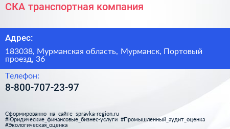 СКА, транспортная компания по адресу 183038, Мурманская область, Мурманск, Портовый проезд, 36 в дальнейшем Организация, размещена в следующих категориях:
