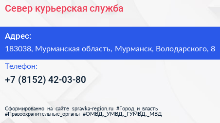 Север, курьерская служба по адресу 183038, Мурманская область, Мурманск, Володарского, 8 в дальнейшем Организация, размещена в следующих категориях: