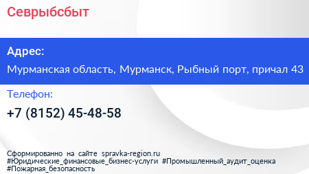 Севрыбсбыт по адресу Мурманская область, Мурманск, Рыбный порт, причал 43 в дальнейшем Организация, размещена в следующих категориях: