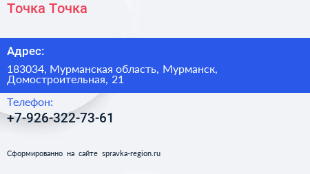 Точка-Точка по адресу 183034, Мурманская область, Мурманск, Домостроительная, 21 в дальнейшем Организация, размещена в следующих категориях: