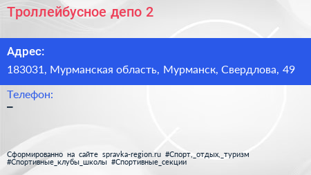 Троллейбусное депо №2 по адресу 183031, Мурманская область, Мурманск, Свердлова, 49 в дальнейшем Организация, размещена в следующих категориях: