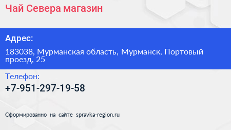 Чай Севера, магазин по адресу 183038, Мурманская область, Мурманск, Портовый проезд, 25 в дальнейшем Организация, размещена в следующих категориях: