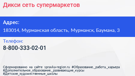 Дикси, сеть супермаркетов по адресу 183014, Мурманская область, Мурманск, Баумана, 3 в дальнейшем Организация, размещена в следующих категориях: