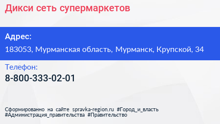 Дикси, сеть супермаркетов по адресу 183053, Мурманская область, Мурманск, Крупской, 34 в дальнейшем Организация, размещена в следующих категориях: