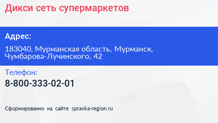 Дикси, сеть супермаркетов по адресу 183040, Мурманская область, Мурманск, Чумбарова-Лучинского, 42 в дальнейшем Организация, размещена в следующих категориях: