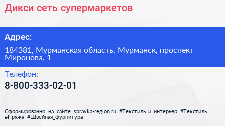 Дикси, сеть супермаркетов по адресу 184381, Мурманская область, Мурманск, проспект Миронова, 1 в дальнейшем Организация, размещена в следующих категориях: