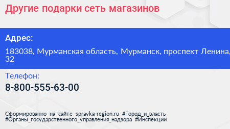 Другие подарки, сеть магазинов по адресу 183038, Мурманская область, Мурманск, проспект Ленина, 32 в дальнейшем Организация, размещена в следующих категориях: