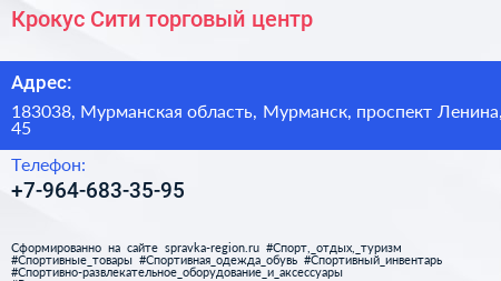 Крокус Сити, торговый центр по адресу 183038, Мурманская область, Мурманск, проспект Ленина, 45 в дальнейшем Организация, размещена в следующих категориях: