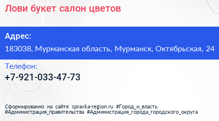 Лови букет, салон цветов по адресу 183038, Мурманская область, Мурманск, Октябрьская, 24 в дальнейшем Организация, размещена в следующих категориях: