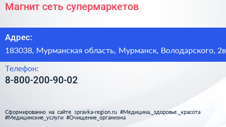 Магнит, сеть супермаркетов по адресу 183038, Мурманская область, Мурманск, Володарского, 2в в дальнейшем Организация, размещена в следующих категориях: