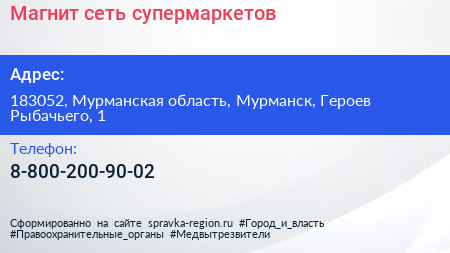 Магнит, сеть супермаркетов по адресу 183052, Мурманская область, Мурманск, Героев Рыбачьего, 1 в дальнейшем Организация, размещена в следующих категориях: