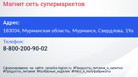 Магнит, сеть супермаркетов по адресу 183034, Мурманская область, Мурманск, Свердлова, 19а в дальнейшем Организация, размещена в следующих категориях: