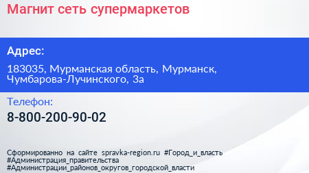Магнит, сеть супермаркетов по адресу 183035, Мурманская область, Мурманск, Чумбарова-Лучинского, 3а в дальнейшем Организация, размещена в следующих категориях: