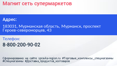 Магнит, сеть супермаркетов по адресу 183031, Мурманская область, Мурманск, проспект Героев-североморцев, 43 в дальнейшем Организация, размещена в следующих категориях: