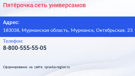 Пятёрочка, сеть универсамов по адресу 183038, Мурманская область, Мурманск, Октябрьская, 23 в дальнейшем Организация, размещена в следующих категориях:
