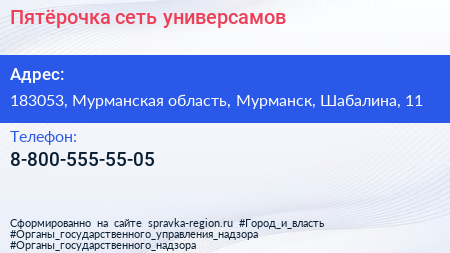 Пятёрочка, сеть универсамов по адресу 183053, Мурманская область, Мурманск, Шабалина, 11 в дальнейшем Организация, размещена в следующих категориях:
