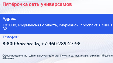 Пятёрочка, сеть универсамов по адресу 183038, Мурманская область, Мурманск, проспект Ленина, 82 в дальнейшем Организация, размещена в следующих категориях: