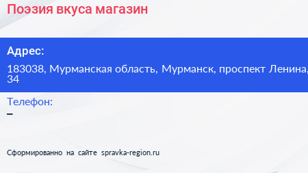 Поэзия вкуса, магазин по адресу 183038, Мурманская область, Мурманск, проспект Ленина, 34 в дальнейшем Организация, размещена в следующих категориях: