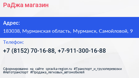 РаДжа, магазин по адресу 183038, Мурманская область, Мурманск, Самойловой, 9 в дальнейшем Организация, размещена в следующих категориях: